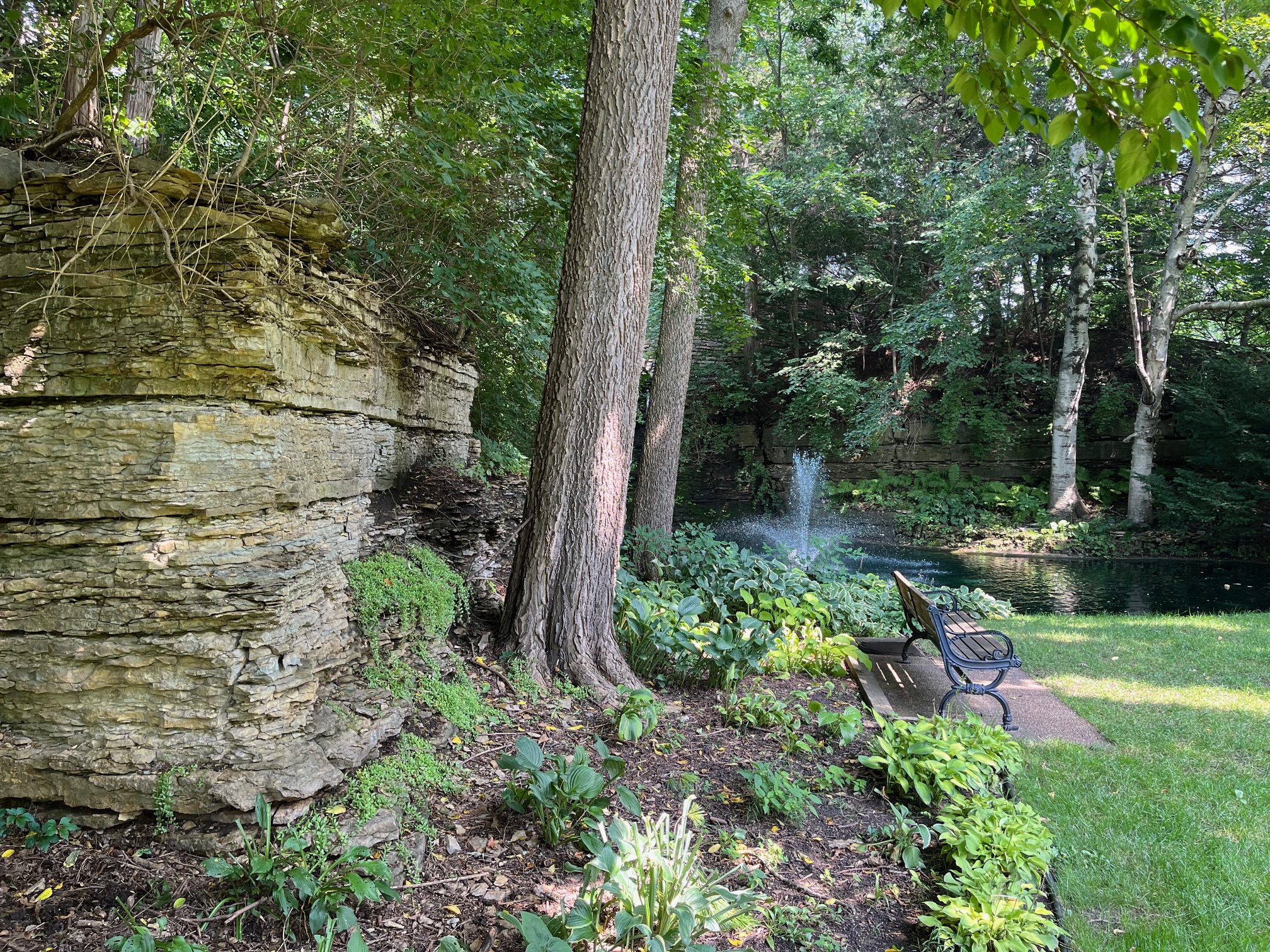 Both ponds are built from concrete and I believe the fountains and the little waterfall are the only aeration. They also use dye to suppress algae growth but being in shady garden corners, one doesn’t notice the dye and the ponds bring a softness to the harshness of the rock walls.