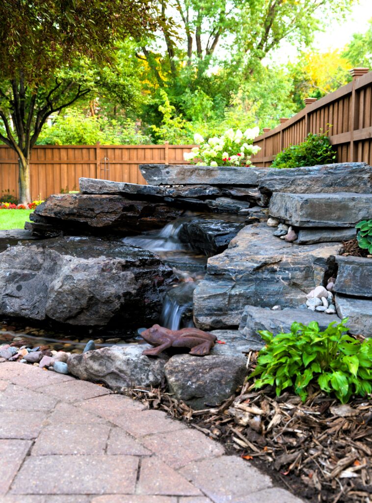Pondless waterfall greats you as you walk to the door in this pleasant, Mendota Heights backyard.