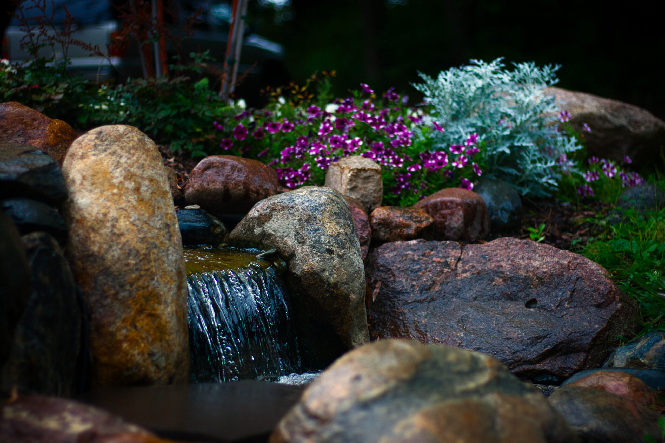 What: 8 ft Pondless Waterfall installed using a vault system and granite boulders. Garden was placed on both sides. The waterfall greets one as you drive up the driveway toward the home in Corcoran, MN.